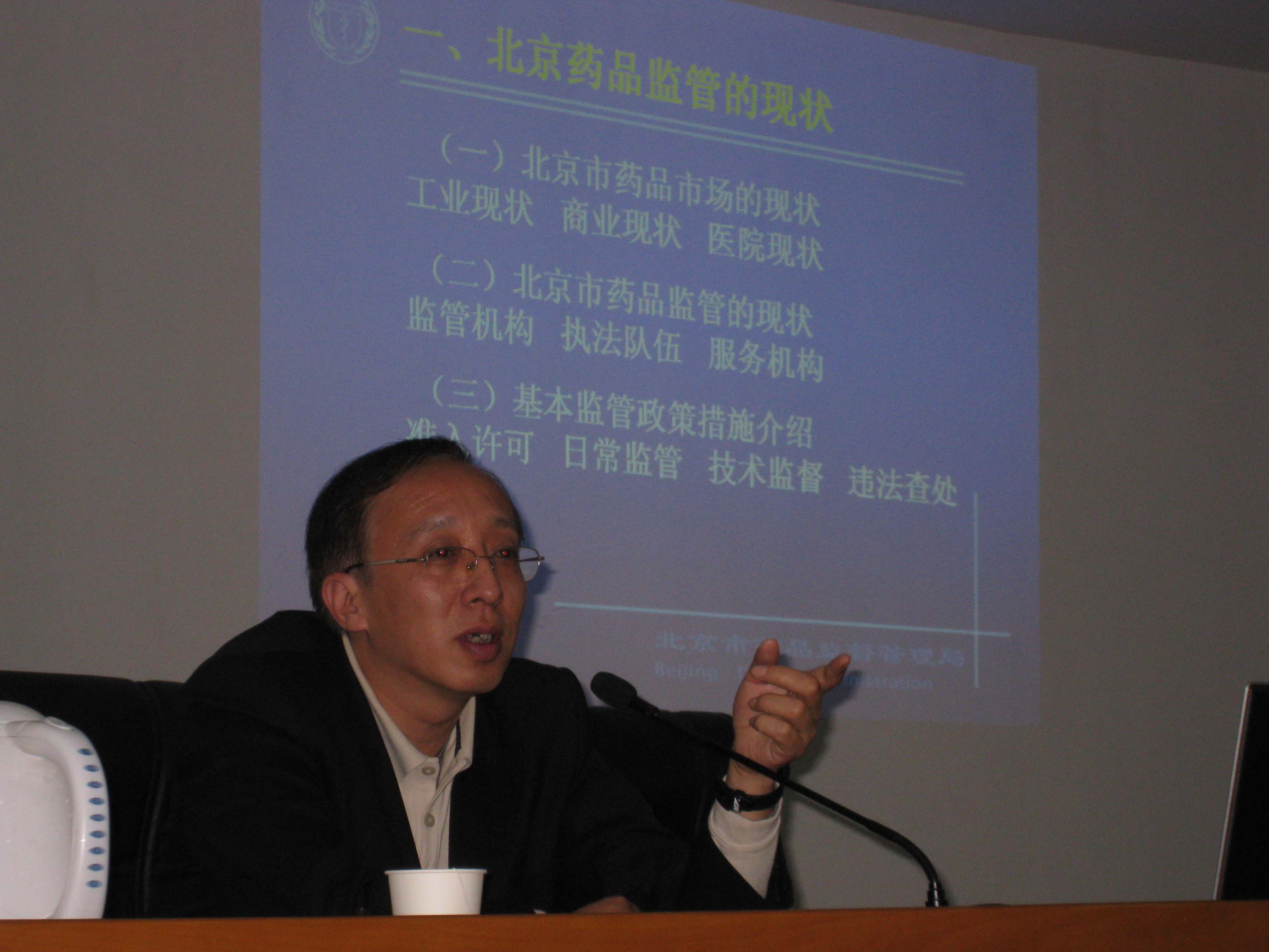 梁洪处长结合实际就我国药品安全监管方面为同学们作了深入浅出的讲解。梁处长首先为大家介绍了北京市药品监督管理现状,并讲解了北京市药品监督管理局各职能部门的职能工作,使同学们对北京市药监局的结构有了更加深入的了解,这使得同学们在准备求职时更有针对性。梁处长还结合我国药品安全监管实例,为大家解读了药品安全监督管理的重要性。梁处长指出,经济发展促使人民生活水平提高,并促进整个社会的发展,社会和公众对公务员的要求越来越高,政府必须有作为才能满足人民日益多元化的需求。梁处长还强调,今后的药品监管工作会更多的加强准入管理、严格执法以及社会化这三个方面,逐步实现“吃北京的药放心”这一目标。
