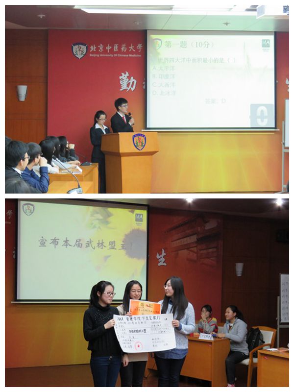 本次活动从11月14日开始,共120位同学通过自发组队的形式报名参与。竞赛题目涉及天文地理、历史哲学、时事政治等各方面知识,旨在调动同学们拓宽视野、获取各领域知识的积极性。经过初赛、复赛和半决赛的激烈比拼,“三个火枪手”队和“五毛”队最终进入决赛,与上一届的“武林盟主”——“流星雨”队争夺冠军席位。三队经过六轮形式多样的角逐,最终“流星雨”队拔得头筹,蝉联“盟主”宝座;“三个火枪手”队夺得第二名; “五毛”队名列第三。