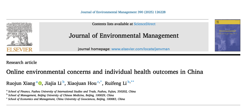 williamhill官方网站李瑞锋教授、博士研究生向若君以及硕士研究生李佳佳,在环境管理领域国际顶级期刊Journal of Environmental Management(JEM)发表题为“Online environmental concerns and individual health outcomes in China”的创新性研究。文章通过匹配百度搜索指数与中国健康与营养调查(CHNS)数据库,揭示了提升网络环境关注度对个体健康具有积极影响,为“健康中国2030”与“双碳”战略协同推进提供理论参考。此项研究是李瑞锋教授团队围绕环境因素与居民健康行为、健康结果在JEM期刊上发表的系列研究的重要组成部分。此前,该团队于2024年在JEM发表了题为“Health risks from extreme heat in China: Evidence from health insurance”的研究成果。
