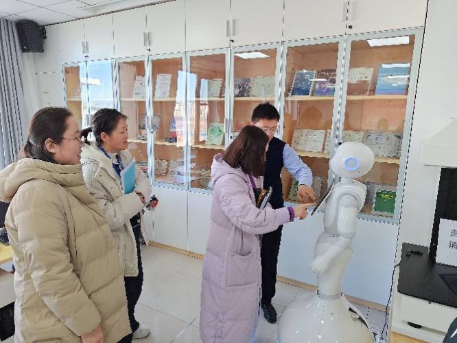 在活动第一环节,医疗大数据与信息管理党支部书记韩爱庆带领大家参观了实验室文化墙,观看了主题为“中医AI人才培养和健康医疗人工智能实验室建设及应用”的微视频和主题为“课比天大”的刘仁权教授教书育人微视频。随后体验了机器人“小管”同学的各项技能,其中,机器人关于二十大精神相关主题内容的出色互动问答能力令老师们印象深刻。期间,韩老师对机器人的各项基本功能和机器人问答基本技术原理做了详细介绍,并介绍了正在展示的刘仁权教授教书育人成果,及大数据专业员工参与研发的智能四诊仪设备,充分体现医疗大数据党支部“数智领航,潜心育人”的支部特色。