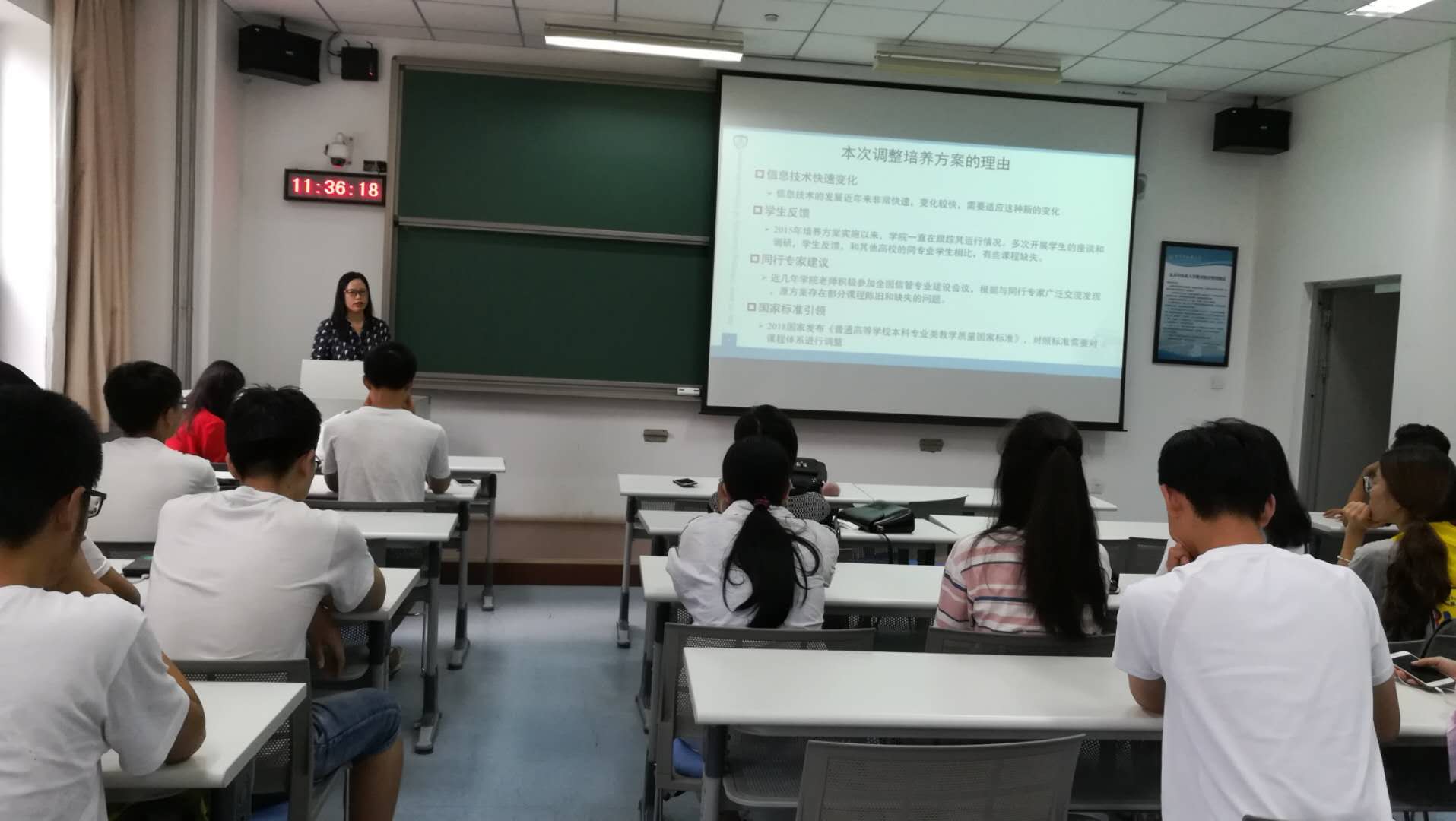 2018年7月16日,火热的期末考试在酷暑中结束了。然而,17信管班的同学们又迎来了新的挑战。此前,williamhill官方网站按照公司教改要求,对信管系的课程方案进行了调整、改革,并将在2018级新生入学后开始实施。与旧方案相比,新方案增加了高等数学等数学课程的学时,加强了Java程序设计的学习,增添了信息资源管理等方面的课程。新方案减少了医学课程的学时,增强了计算机技术方面的专业课程,使整个课程体系更适应信管方向的就业需求和考研深造。如何面对这一变化,是否采用新的培养方案,关系着每一位同学未来的学业发展。为此,小学期上课期间,17信管班在班主任唐燕老师的主持下,召开了班会,对是否也采用新的课程方案进行了讨论。为了使大家对新方案了解得更加清晰,信管系的郭凤英老师和公司教办的王鸿蕴、张勇老师到会进行了指导和讲解,很多同学甚至请假出席了会议。班会上,郭凤英老师首先为同学们介绍了课程方案改革的背景,和新旧方案的比较,之后,在唐燕、王鸿蕴等老师的指导和帮助下,同学们分组针对新老方案的利弊展开了激烈的讨论。