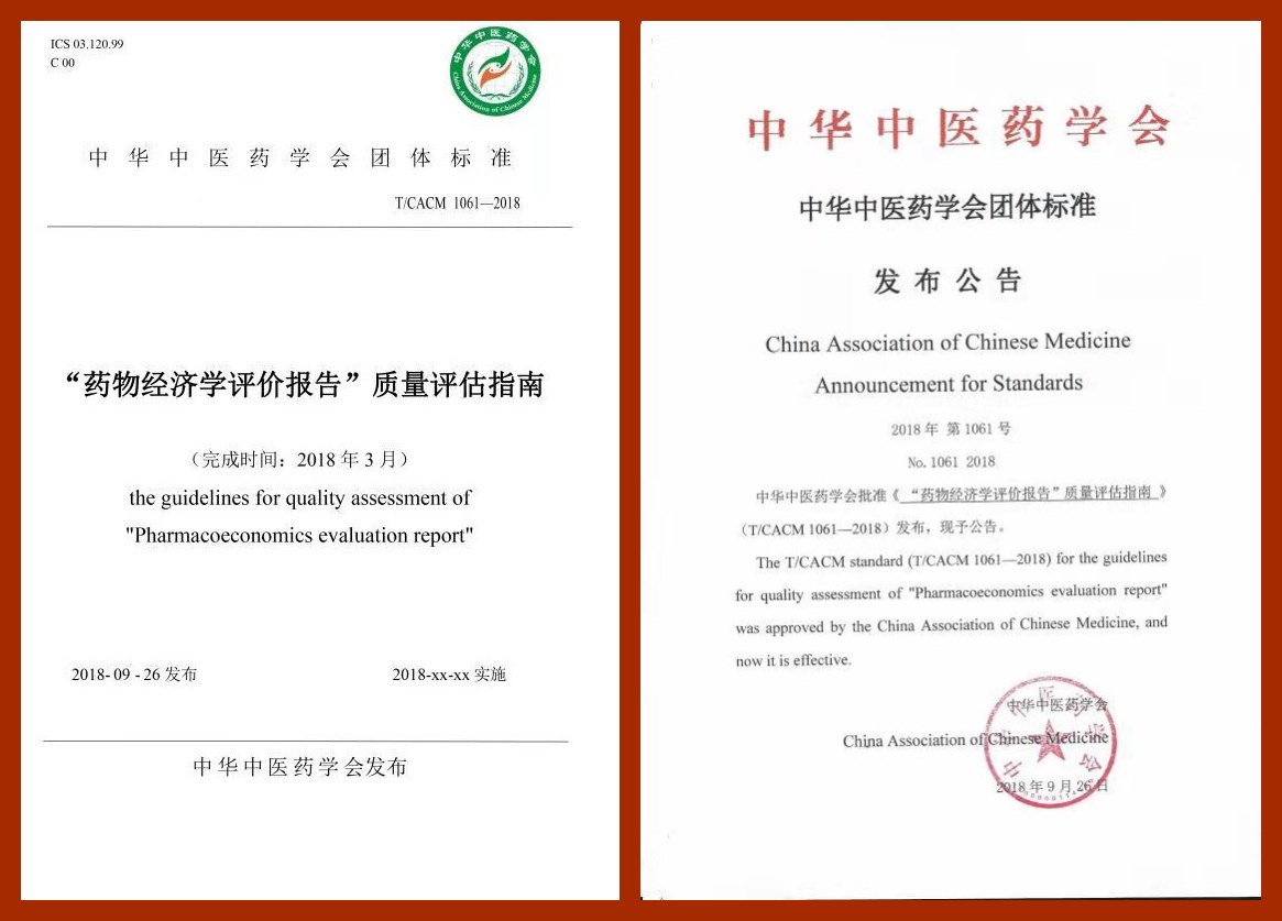2018年9月26日,我国首个“药物经济学评价报告质量评估”行业团体标准——《“药物经济学评价报告”质量评估指南》经中华中医药学会批准正式发布。