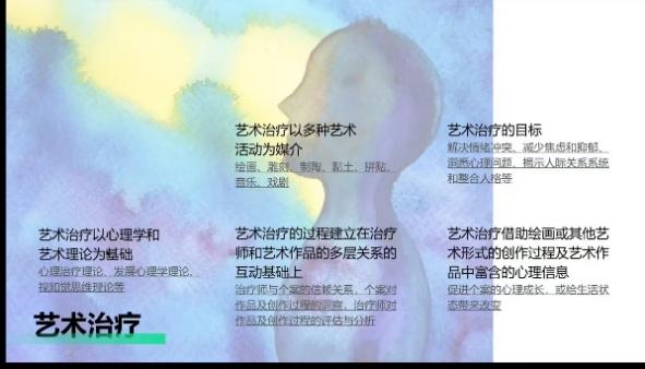 在讲座中,张老师详细阐述了艺术治疗在各领域的实践案例与应用趋势。介绍了在医院、社区、美术馆\博物馆、公司等不同场景下,以绘画、音乐、拼贴、黏土、数字技术等多种艺术媒介,通过艺术创作与反思作品,在诊断和疗愈心理或情绪问题及由此引发的相关疾病、特殊人群等议题上发挥的独特作用。她还分享了不同场景下,国内外艺术治疗实践探索案例,如蒙特利尔美术馆与阿尔茨海默症协会合作艺术治疗项目、中央美术公司艺术治疗研究中心招募多家高校老员工开展的“知心伙伴”社区艺术疗愈项目等。在公司场景中,艺术治疗助力员工心理健康成长。针对困境儿童和中员工面临的不同问题,如学习压力、心理困扰等,艺术治疗可以帮助其培养积极情绪,洞察正向特质,提升自我认知。