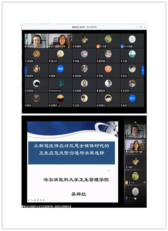 吴群红教授主要从两个部分展开讲座。首先,从新冠疫情产生的背景和社会现象展开论述,吴群红教授结合实例,分别分析了中国和美国新冠疫情中风险感知和沟通问题产生的原因,提出了风险沟通带来的问题和引发的思考,重点讲解了卫生应急风险沟通的特点、新媒体环境下卫生应急风险沟通面临的挑战,突发事件及应急沟通不畅带来的公众心理行为问题等内容。其次,从新冠疫情背景下卫生管理的应对策略展开论述,阐述了面对复杂的突发公共卫生事件,卫生应急处置过程中的多元主体实现协同治理的途径、方法与综合策略,政府、卫生应急机构沟通的渠道、程序和注意事项,以及对公众开展心理危机干预的方法。