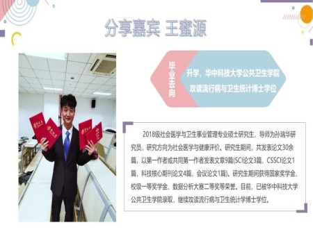 王蜜源同学建议大家要尽早规划自己未来的毕业去向,如果打算读博,要尽早着手中英文论文的撰写及投稿,在院校选择上可以优先考虑未来就业城市。同时,强调导师的选择和联系也是申博的关键,祝愿大家都可以实现自己的理想目标。