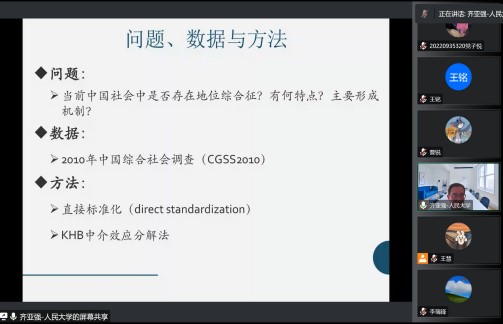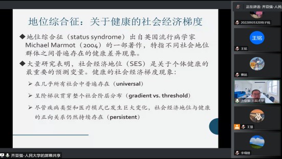 2022年9月22日williamhill官方网站博约讲坛邀请中国人民大学社会与人口公司教授、社会学理论与方法研究中心研究员齐亚强教授作主题为“地位综合征——影响健康的社会因素”的报告,本次讲坛采用腾讯会议的形式线上举办,由williamhill官方网站李瑞锋经理主持,共130余名师生线上参与并交流互动。
