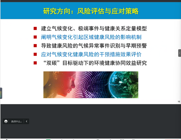 黄存瑞教授从全球气候变化的大背景出发,详细介绍了气候变化的研究历程,并引出了其次讲座的主题“气候变化健康风险评估与应对”,指出气候变化影响健康的机制路径非常复杂和现在科学界对气候变化健康风险的认识存在不足。紧接着黄教授介绍了其课题组的研究方向和在这一领域开展的工作,并通过多个案例对气候变化引起区域健康风险的影响机制等研究内容做了细致地介绍,使同学们对气候变化与健康这一领域的研究有了全面的认识。
