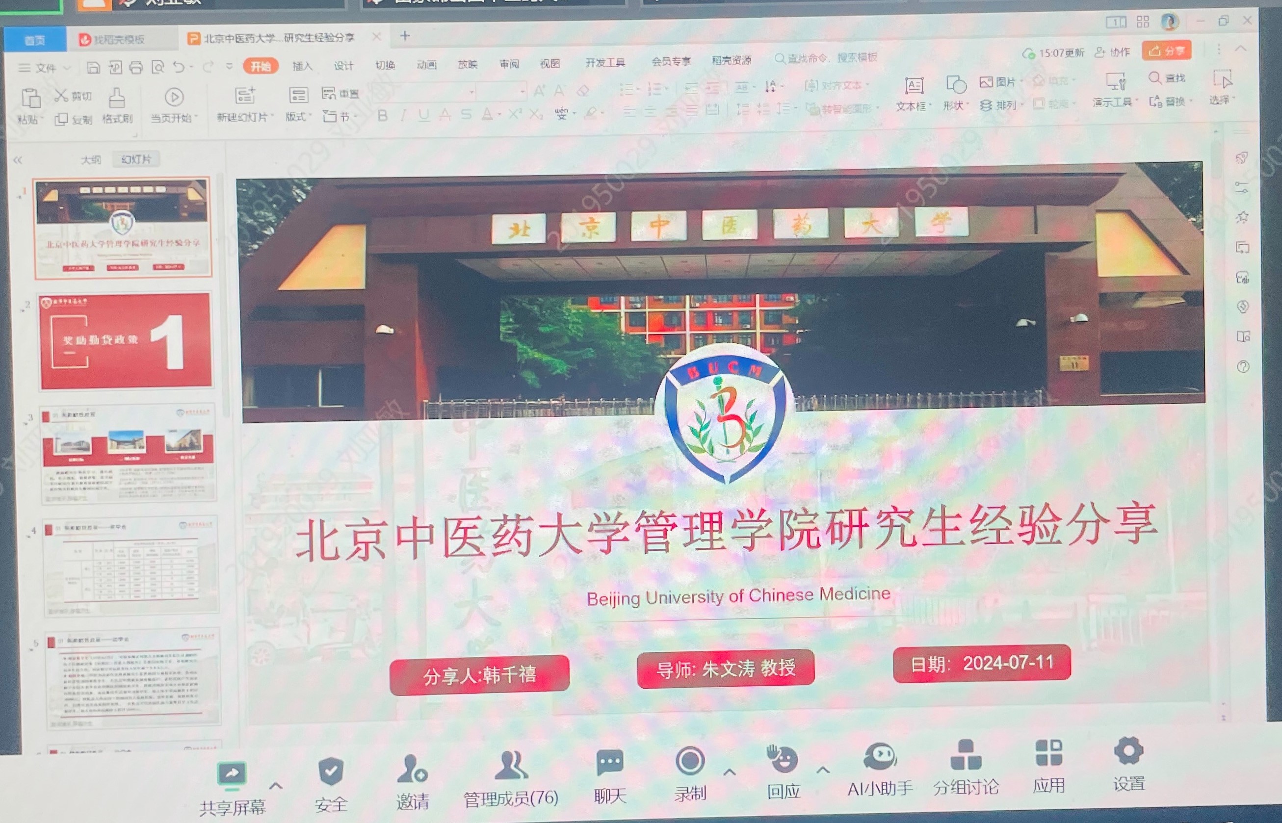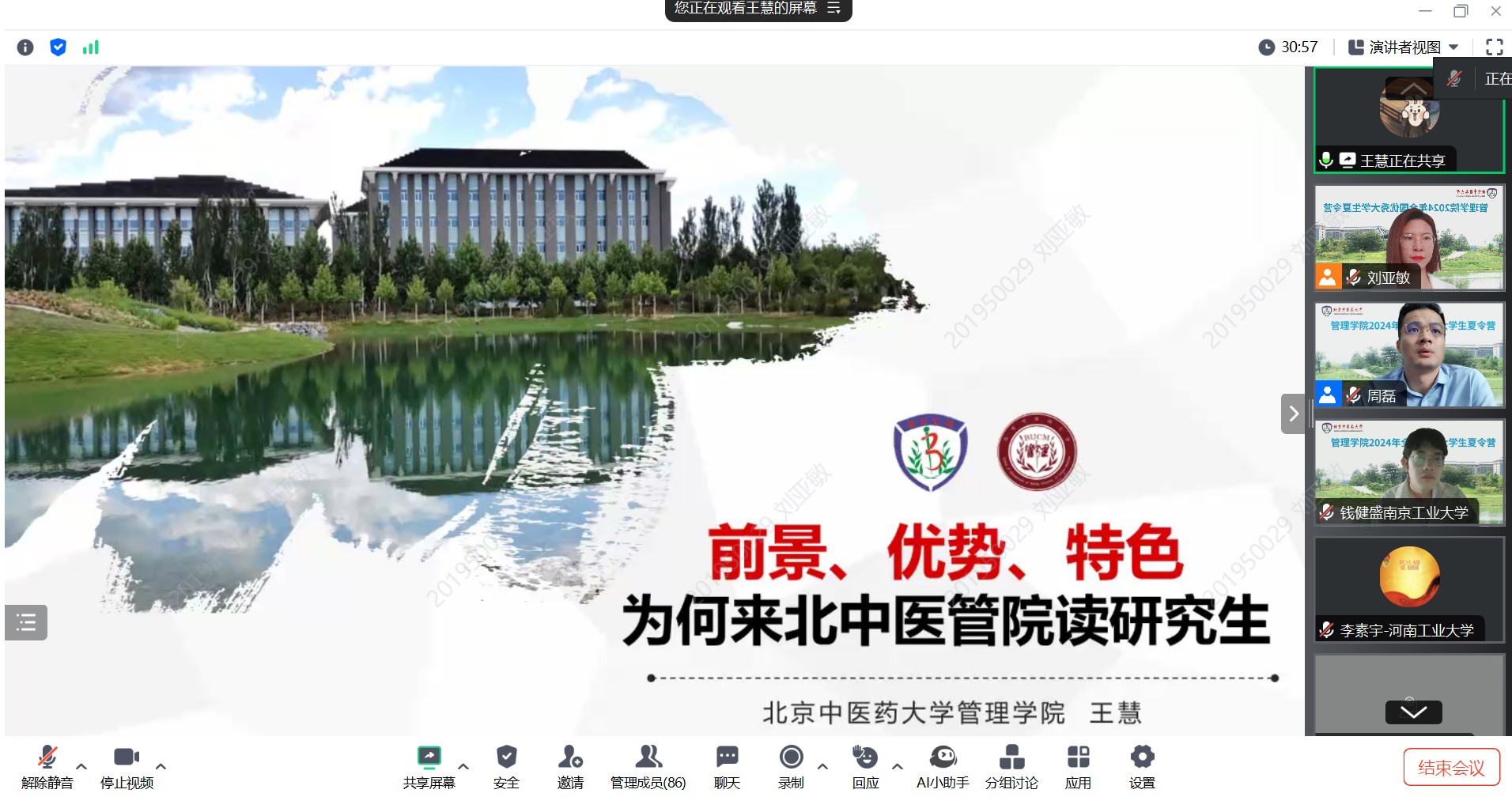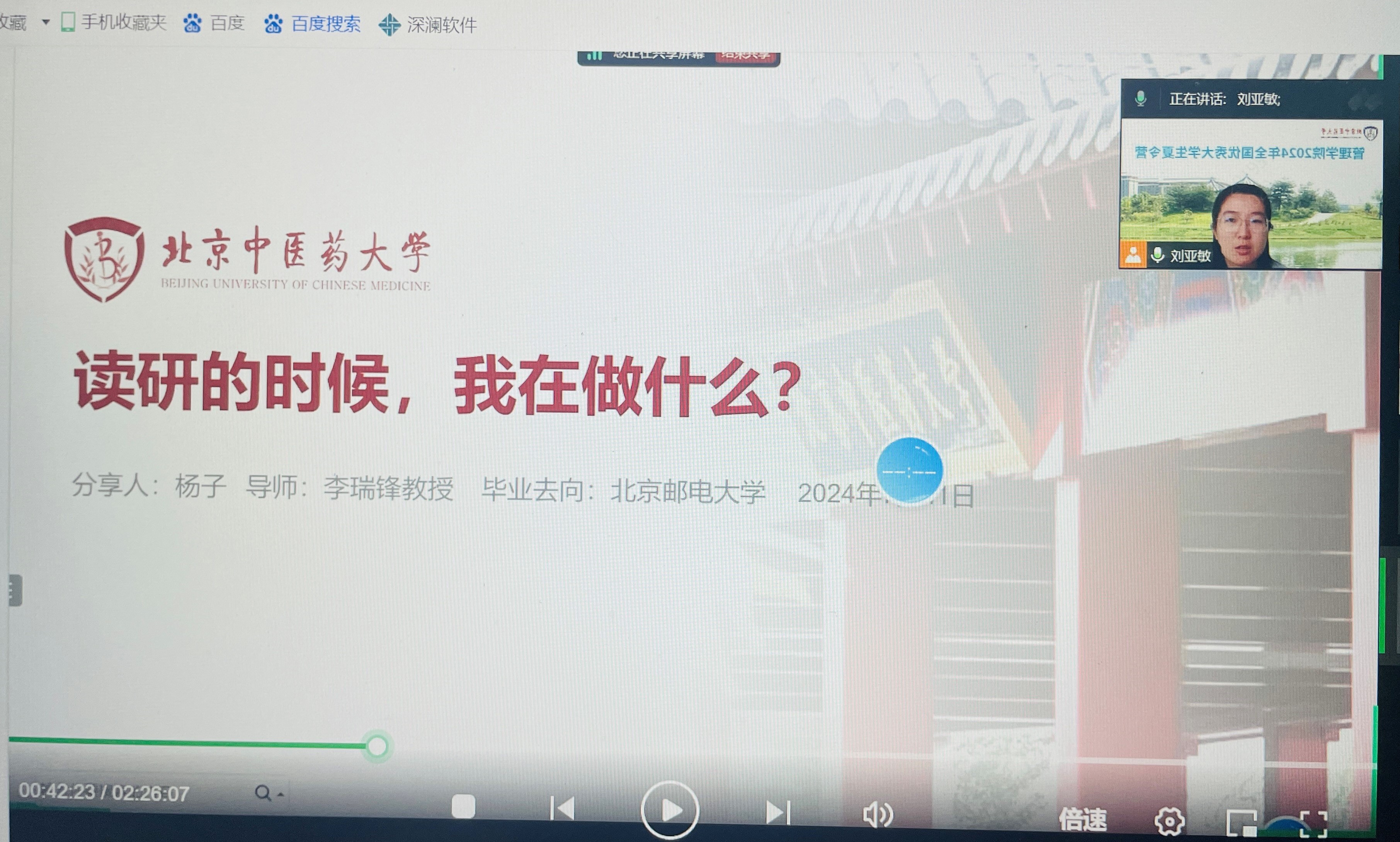 优秀毕业生分享环节,目前就职于中国医学科公司阜外医院的刘传绪(2018届员工)与北京邮电大学的杨子(2022届员工)分别从研究生期间的时间管理、导生关系、就业选择等方面进行了生动有趣的分享。在校生分享环节, 2022级管硕班韩千禧、陶睿嘉2位优秀在校生向营员们介绍了自己在北中医williamhill官方网站的学习与生活经验,使营员对研究生生活的向往更加具象化、生动化。