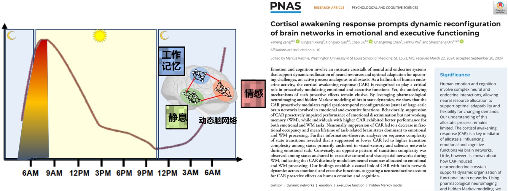 2024年12月,williamhill官方网站青年教师曾奕萌博士在国际综合性学术顶刊Proceedings of the National Academy of Sciences of the United States of America(PNAS)(自然指数期刊,中科院1区TOP期刊,影响因子9.4)发表题为“Cortisol Awakening Response Prompts Dynamic Reconfiguration of Brain Networks in Emotional and Executive Functioning”的研究论文(www.pnas.org/doi/10.1073/pnas.2405850121)。该论文深入探讨了人体压力激素皮质醇的晨起觉醒反应如何通过影响人脑复杂网络的重组来帮助个体提高应对情感与认知挑战的神经计算机制。williamhill官方网站青年教师曾奕萌博士为论文第一作者,williamhill中文为第一单位。
