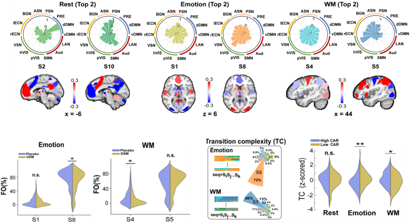为此,williamhill官方网站青年教师曾奕萌博士与北京师范大学认知神经科学与学习国家重点实验室科研团队合作,基于随机对照实验设计(Randomized Controlled Trial, RCT),采用药物方法因果性地操纵个体的CAR水平并探究其如何影响个体情感与认知功能。研究同时结合了高场强功能磁共振成像(fMRI)与前沿的动态脑网络的机器学习建模方法,深入探究了CAR调控关键情感脑网络与认知脑网络的神经计算机制。研究首先发现CAR提高了个体在情感与认知任务中的行为表现,呈现出正向支持作用。进一步的,通过解码个体人脑网络快速重组模式,我们发现CAR显著改变了个体在执行情感与认知任务中的核心脑网络的动态重组模式。最后,借助统计物理方法对人脑网络系统切换复杂度进行测算,研究还发现CAR通过灵活的神经资源分配(neural resource allocation),调节了情感与认知过程中的特异性状态编码模式,从而实现了系统能量在情感功能与认知功能间的灵活分配。